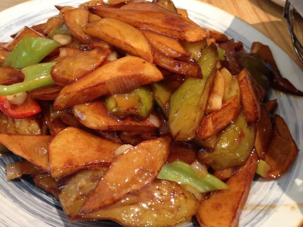 This is a great vegetarian classic from Dongbei, literally translating to 'Earth Three Fresh". As in, three fresh vegetables from the earth, if you couldn't connect the dots. Toss some potatoes, green peppers, and eggplant (aubergine) into a wok and you've got something fried and delicious that perfectly compliments your guo bao rou. As with most things in Dongbei, a shitload of garlic makes this one work nicely.